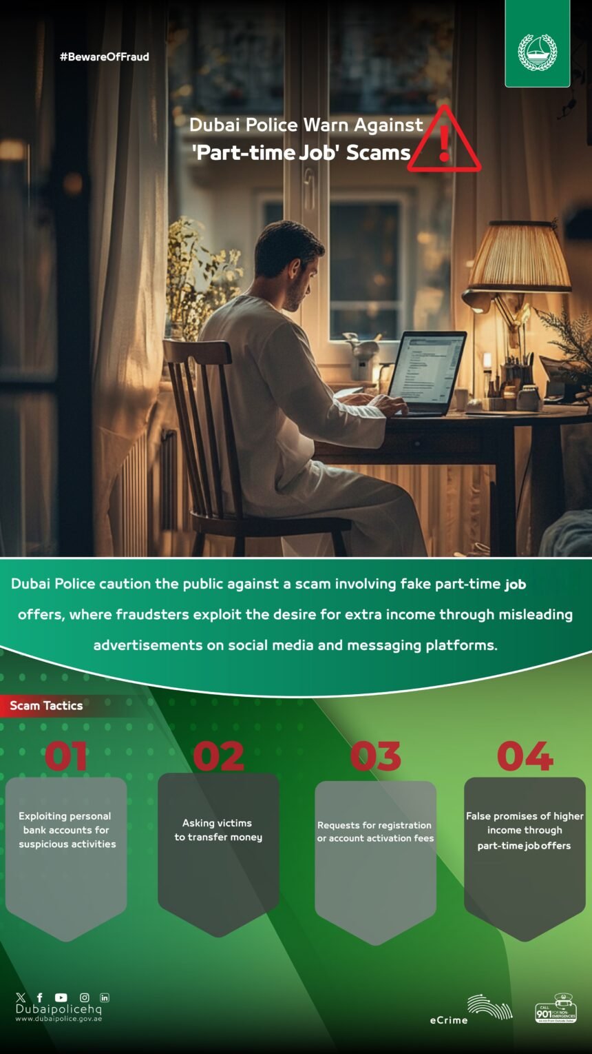حذّرت شرطة دبي أفراد المجتمع من أسلوب احتيالي متزايد في الآونة الأخيرة، يعتمد على إيهام الضحايا بوجود فرص عمل جزئي، ويستغل فيه المحتالون رغبة الضحايا في تحسين دخلهم، عبر عروض وظيفية وهمية يتم الترويج لها من خلال منصات التواصل الاجتماعي أو تطبيقات المراسلة.